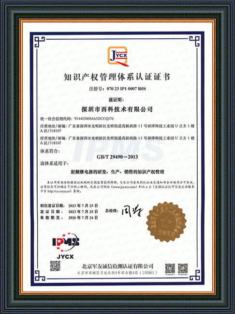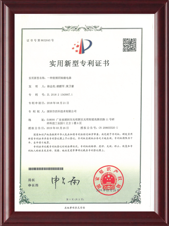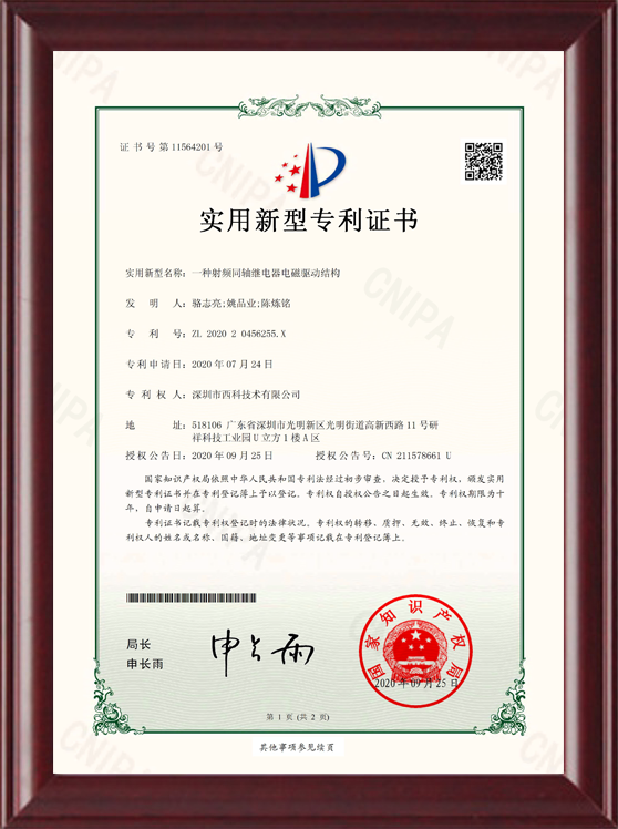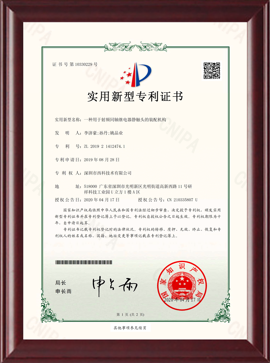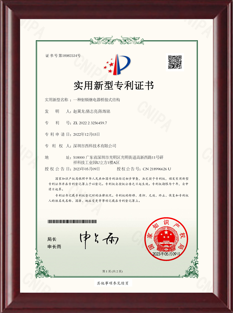 深圳市西科技术有限公司成立于2016年5月,现注册资本2650万人民币,是国内率先开展极高频射频继电器/微波继电器/射频开关/微波开关/同轴开关/机械开关研发的国家级高新技术中小型企业,集研发设计、生产、测试、销售为一体。公司已拥有频率覆盖DC~67GHz的射频继电器/微波开关多系列产品,拥有GJB9001C/ISO9001、ISO14001/ISO45001、GB/T29490-2013体系认证,发明专利10余项、软件著作权9项,在射频继电器领域累计申请专利数量50多项(国内业内专利占比超过60%),可为高速线缆测试、测试开关矩阵、精密测量装备、无线通信、微波雷达、卫星通信与导航等系统提供射频/微波控制器件和解决方案。